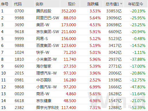 恒生科技指数成分股中,市值排名居前的公司股价涨幅多数超过5%。