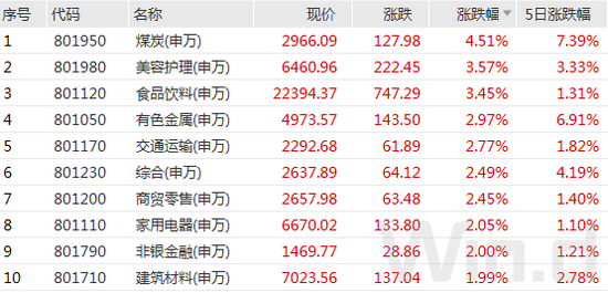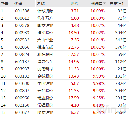 从涨幅居前的板块来看,煤炭、有色等周期板块成为市场关注焦点,特别是有色金属板块,怡球资源(维权)、焦作万方、闽发铝业、神火股份、天山铝业、横店东磁、和胜股份、博威合金、丽岛新材、金徽股份、中国铝业、云铝股份等10多只个股涨停。