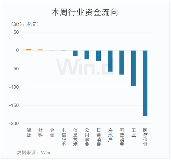 从本周行业资金流向来看,主力资金净流出400多亿元,多数行业净流出,其中医疗保健板块净流出额超170亿元,位居首位;工业、可选消费、房地产等板块净流出额亦较高。能源、材料、金融等板块则小幅净流入。