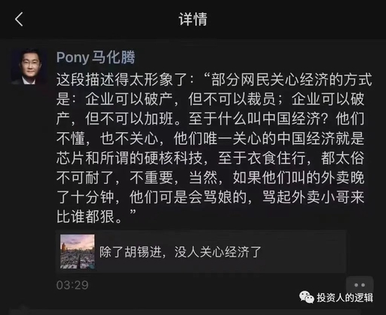 无独有偶,网传马化腾的夸胡锡进对经济的评论发言,也让大家对不怎么爱在公众面前表态的马化腾表示出极大的热情。果然,频繁出来发言没好处,反而是越闷越容易收到关注。只要知名度足够,曝光率低了反而会形成爆炸性的言论。反正马化腾也不怕微信封杀,说两句话表达一下意思湿湿碎啦。不过,网上又传了他自己辟谣的截屏说他没说过,有点像网络频繁引用鲁迅的话时,鲁迅说他没说过,但是他觉得说的对一样的奇妙感觉。极短的时间内,胡锡进也赶紧说还有好多人都在关心经济,被大佬点名的愉悦感带来的刺激并不长久,迅速反思反省,合并同类项融入大众才是王道。