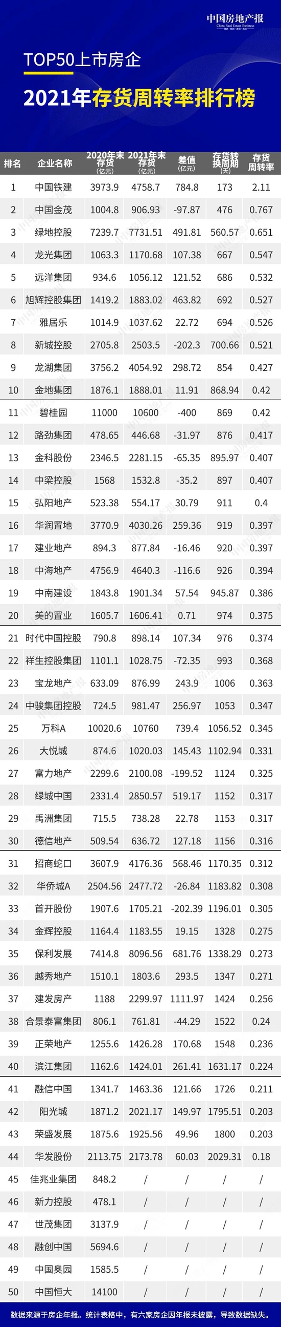 根据中国房地产报记者统计数据,2021年TOP50上市房企平均存货周转率为0.407,较2020年末存货周转率平均上升了0.042。存货上升同时周转率也上升,说明房企销售速度小于土地储备增加和可售面积增长速度。
