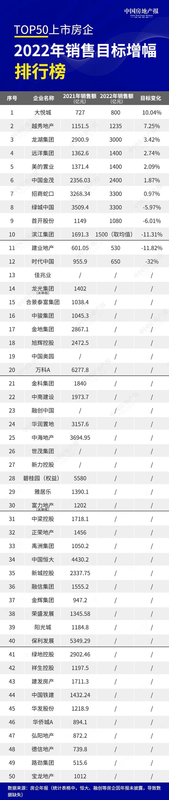 在已知对外披露业绩目标的房企中,只有大悦城计划增长超过10%,目标值为800亿元。2021年,大悦城曾将业绩目标增长定为超过20%,但在如今的行业形势下,大悦城又将该数值减半。