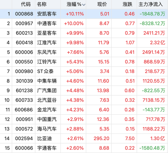 午后汽车板块整体加强,板块掀起涨停潮,安凯客车、钱江摩托、泉峰汽车、宇通重工、星帅尔、江淮汽车、通达动力、福达股份等近20股涨停。