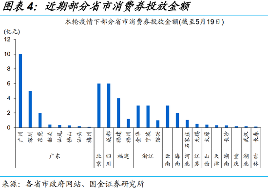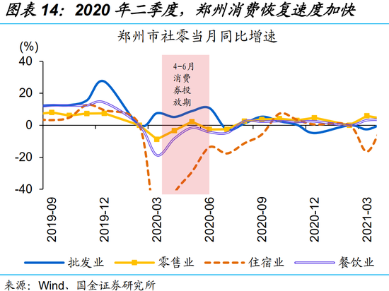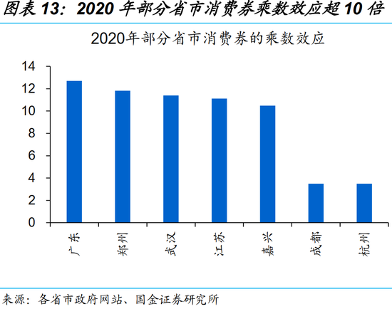 地方促消费短期乘数效应较大,有助于地区消费阶段性企稳。以消费券为例,消费券为满减券、即达到一定金额才能享受优惠,具有一定的乘数效应。2020年,广东、郑州、武汉等部分省市消费券发放,带来的消费乘数效应能达到10倍以上,但持续时间偏短、多为一到两个月。以郑州市为例,2020年郑州消费券发放集中在4-6月,带动社零阶段性企稳回升。