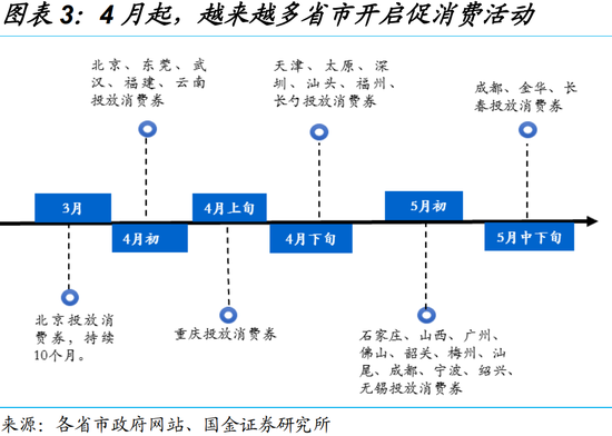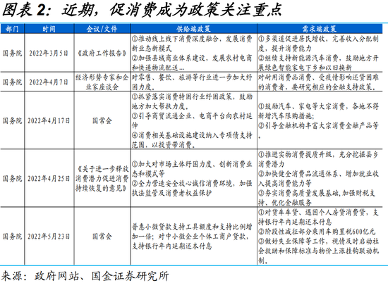 近期,中央部署促消费措施,从供需两端促消费。4月以来,国务院多个会议强调促消费、4月底专门出台促消费相关意见,按照促消费的方式可分为需求端和供给端措施,需求端措施包括,消费券、消费补贴、汽车购置税减免等直接措施,及稳就业、增加收入提高消费能力等间接措施;供给端措施包括,尽可能降低疫情对线下活动的影响,及加强县域商业体系建设、专项债支持消费基建等。