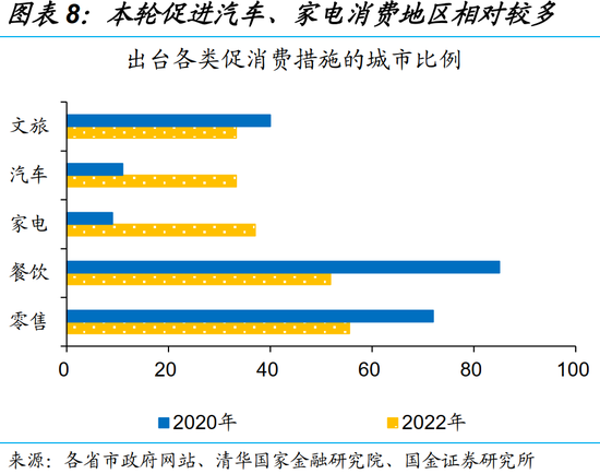相较2020年,本轮促消费力度或更大,加大对汽车、家电等耐用品消费刺激。时隔五年,中央再度出台汽车购置税减免相关措施,阶段性减征规模600亿元。地方促消费资金投入规模相对较小,目前低于2020年3月至5月中旬的约190亿元;但当前统计的促消费地区数量明显少于后者、2020年有28个省市170个城市,后续不排除更多地区推出。相较2020年,当前促进汽车、家电消费的地区数量占比提升20个百分点以上。