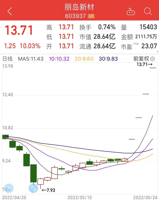 具体看,丽岛新材5月19日公告投资10亿元在五河县建设“新能源电池集流体材料项目”,建设高端电池级铝箔生产线。公告发布后,该公司股价已4个一字板。