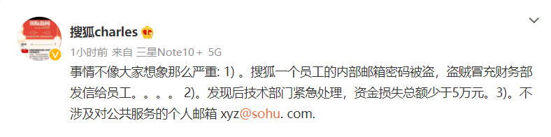 5月25日午间,搜狐CEO张朝阳发微博回应称,事情不像大家想的那么严重。他表示,事件起因是搜狐一个员工的内部邮箱密码被盗,盗贼冒充财务部发信给员工。公司发现后,技术部门紧急处理,资金损失总额少于5万元。另外,此次发送诈骗邮件的不涉及对公共服务的个人邮箱 [email protected].