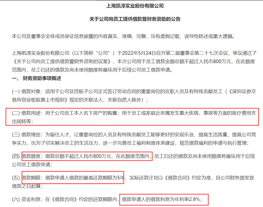 第二件事情,上海一家上市公司发布公告称,将向重要岗位的员工提供总额不超过800万的贷款,用于员工本人名下房产的购置,以及员工或家庭近亲属发生重大疾病、事故等方面的医疗费用支出周转等。在《借款合同》约定的还款期限内,借款申请人的借款利息为年利率2.9%。