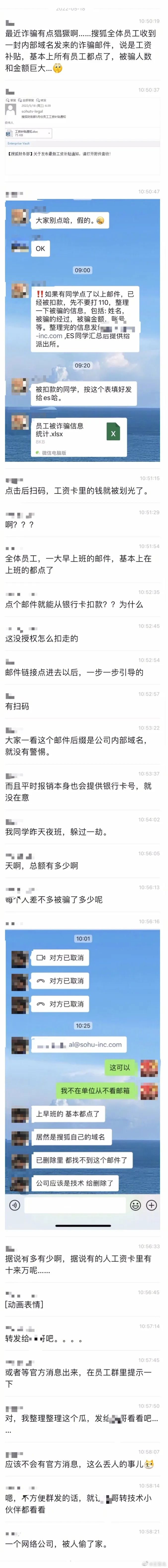 第一件事情是,一条来自网络的微信群聊记录显示,搜狐全体员工在5月18日早晨收到一封来自“搜狐财务部”名为《5月份员工工资补助通知》的邮件,大量员工按照附件要求扫码,并填写了银行账号等信息,最终不但没有等到所谓的补助,工资卡内的余额也被划走。