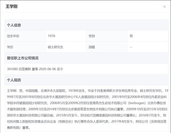 巨潮网公布的百普赛斯董监高信息显示,上市公司董事王学刚与金准医学检测实控人履历吻合。