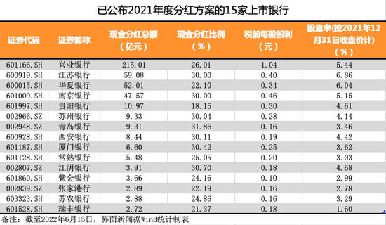 截至6月15日,已有12家银行完成分红,包括张家港行、瑞丰银行、苏州银行、江阴银行、江苏银行、青岛银行、常熟银行、华夏银行、贵阳银行、紫金银行、苏农银行和兴业银行,共计377.26亿元现金送达股东。