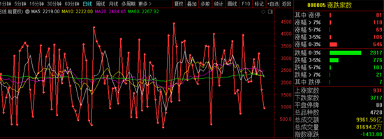 今天两市上涨家数900多家,下跌3700多家,涨停81家,跌停有十余家,今天成交量9963亿,又跌回至万亿以下。