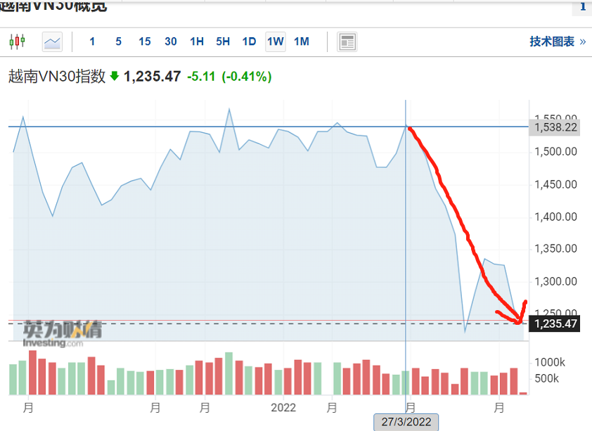 从股市来看,越南股市这两三个月跌了也不少:VN30指数在3月27日,还是1500多点,现在6月26日来看,只有1200点出头了,20%的跌幅吧。
