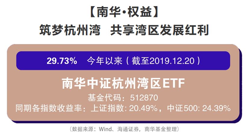 •南华中证杭州湾区ETF, 2018年12月14日成立, 2019Q1、2019Q2、2019Q3业绩分别为22.7%、-4.95%、3.70%,同期业绩比较基准收益率分别为31.41%、-5.72%、2.91%。数据来源:南华中证杭州湾区ETF定期报告,统计日期2018年12月14日至2019年9月30日,业绩比较基准:本基金的业绩比较基准为标的指数收益率。本基金标的指数为中证杭州湾区指数。