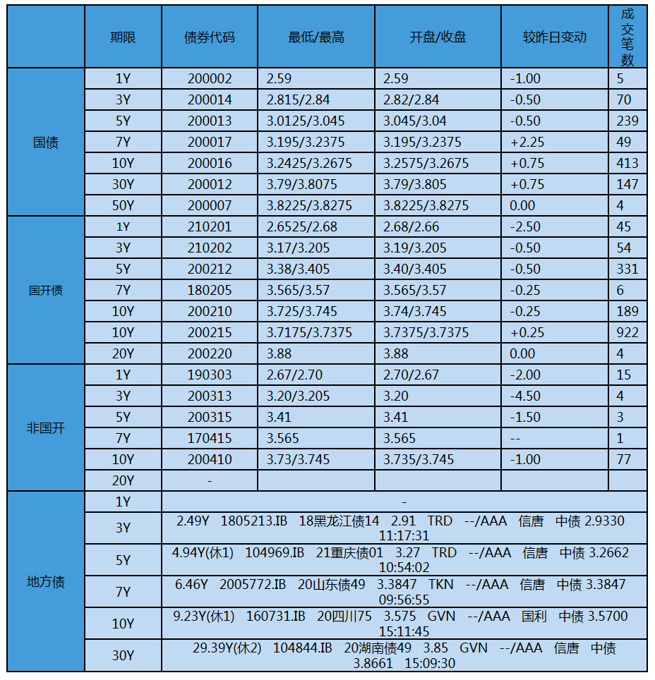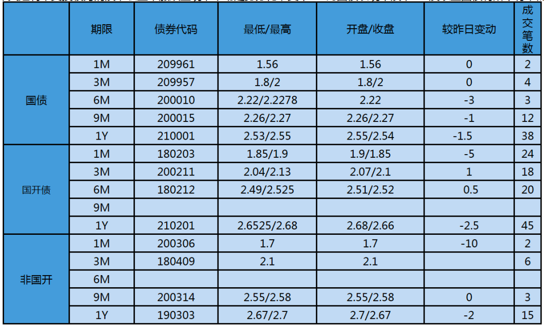 今天短利率交投较为清淡,收益率涨跌互现,市场走势分化,其中3M内国债表现平淡,6M及以上国债有所下行,而金债方面,则是1M内及1Y附近品种走强,其余期限表现较弱。