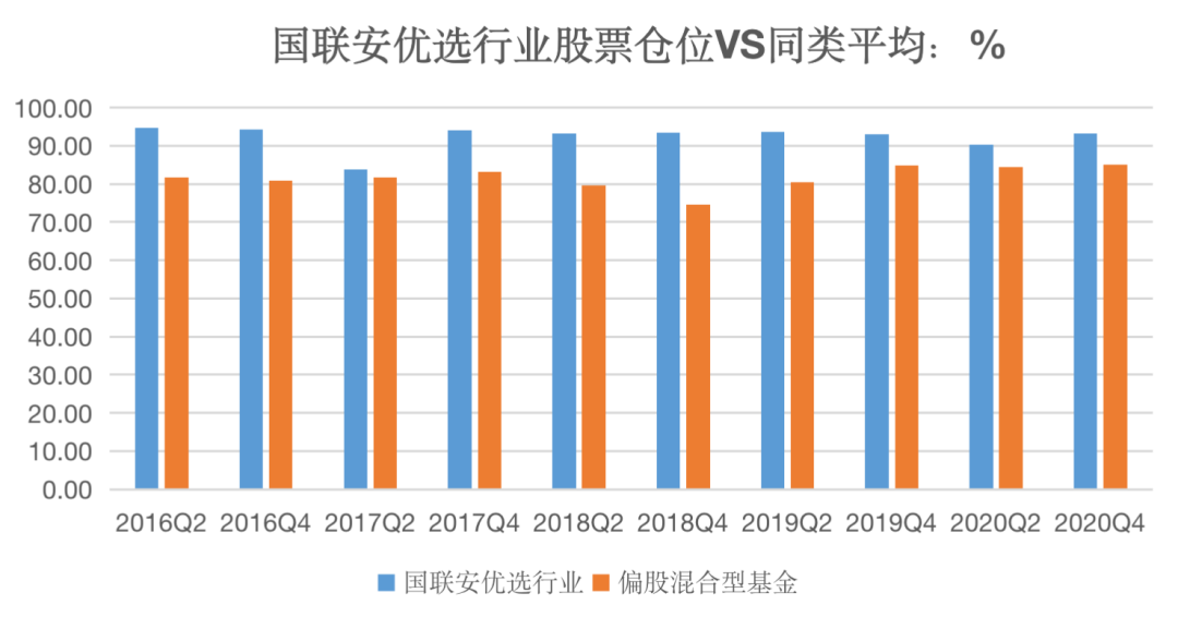 以潘明管理时间最长的国联安优选行业为例,据基金定期报告,国联安优选行业在近五年里各个时期(以半年计)股票仓位均高于同类均值,一直维持在高仓位运作,可见基金经理的收益来源更多来自于选股而非择时。