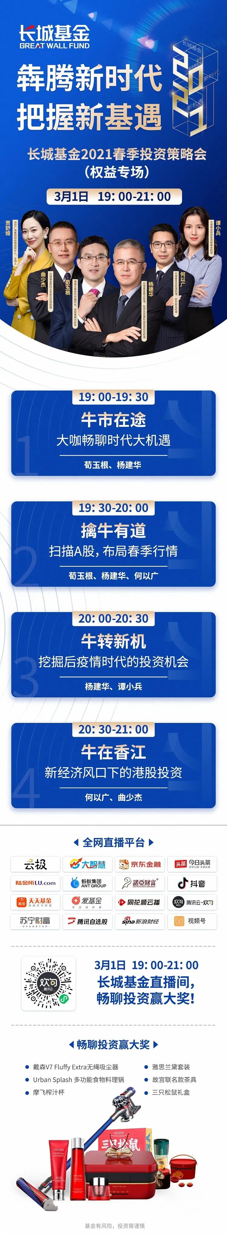围绕一系列投资者关注的热点话题,长城基金将于3月1日晚19:00至21:00举办“2021年春季投资策略会权益专场”,主题为《犇腾新时代,把握新机遇》,并在16个平台全网直播。