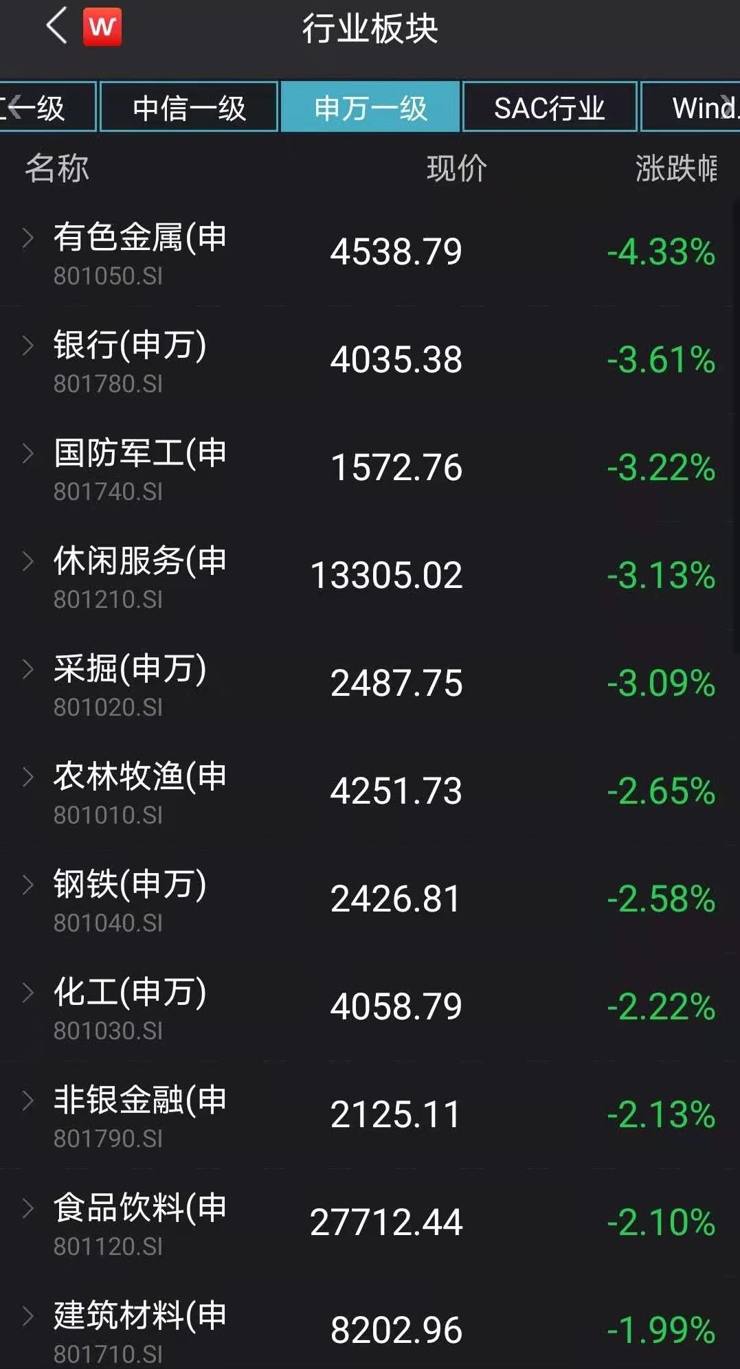 从板块来看,今日28个申万一级行业除公用事业微涨外,其余尽数翻绿,此前市场颇为关注的中小市值个股普涨行情不再。前期大涨的有色金属板块今日以4.33%跌幅垫底,银行、国防军工、休闲服务、采掘等板块日跌幅均在3%以上。
