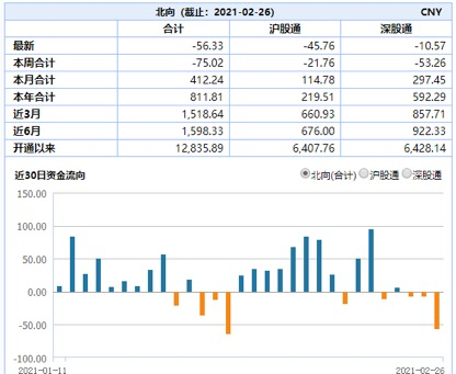 此前连续2个交易日流出的北向资金,今日加大离场力度。Wind数据显示,2月26日全天北向资金净流出56.33亿元,为近一个月来日净流出规模新高。2月以来,北向资金合计净流入412.24亿元,年内净流入规模也收窄至811.81亿元。