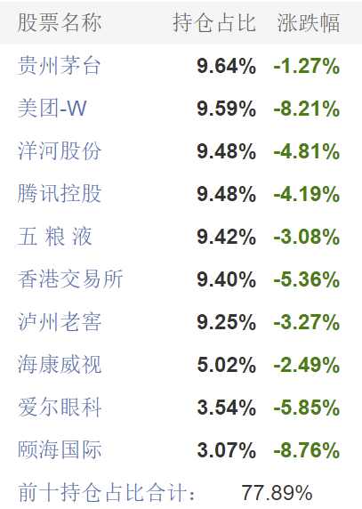 截至2020年12月31日,易方达蓝筹精选前十大重仓股分别为贵州茅台、美团-W、洋河股份、腾讯控股、五粮液、香港交易所、泸州老窖、海康威视、爱尔眼科、颐海国际。