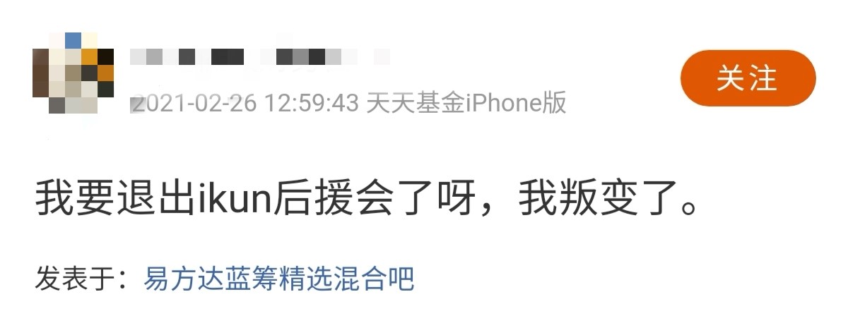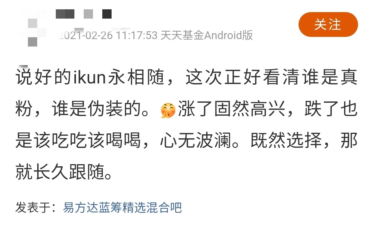 记者查阅易方达蓝筹精选混合吧发现,在追随张坤的基民中,有的表示这是看清谁是“真粉”的机会,目前心无波澜还将继续支持、长久跟随。有的则表示自己已经“叛变”,准备退出IKUN后援会。