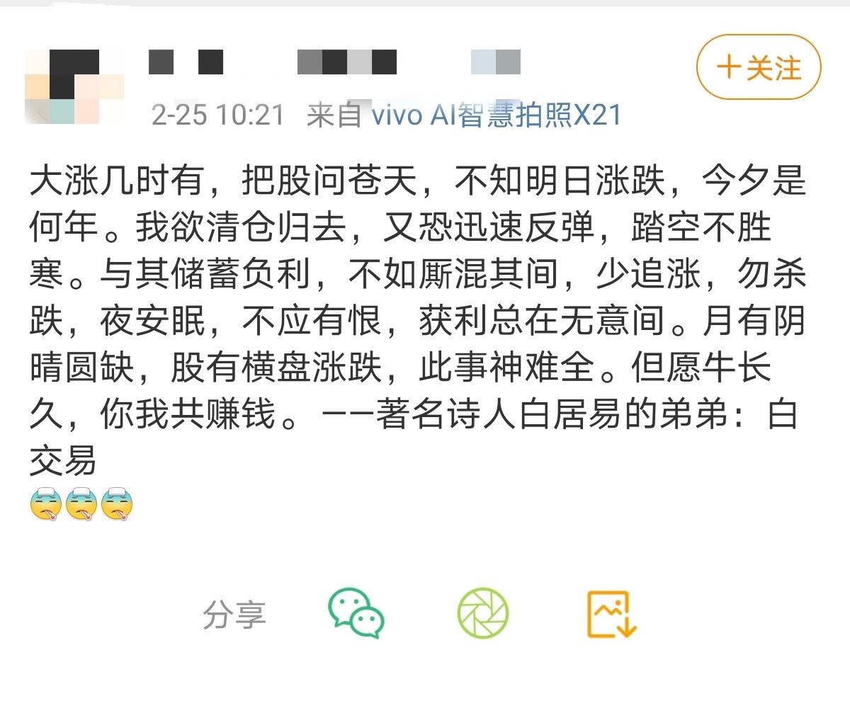 更有股民称,在大盘下跌时“别人恐惧我加仓,别人小亏我破产。”另有股民回应:听君一席话,多打十年工。