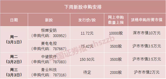 根据新股发行安排,下周(3月1日至3月5日)A股将有4只新股申购,包括科创板3只、创业板1只。