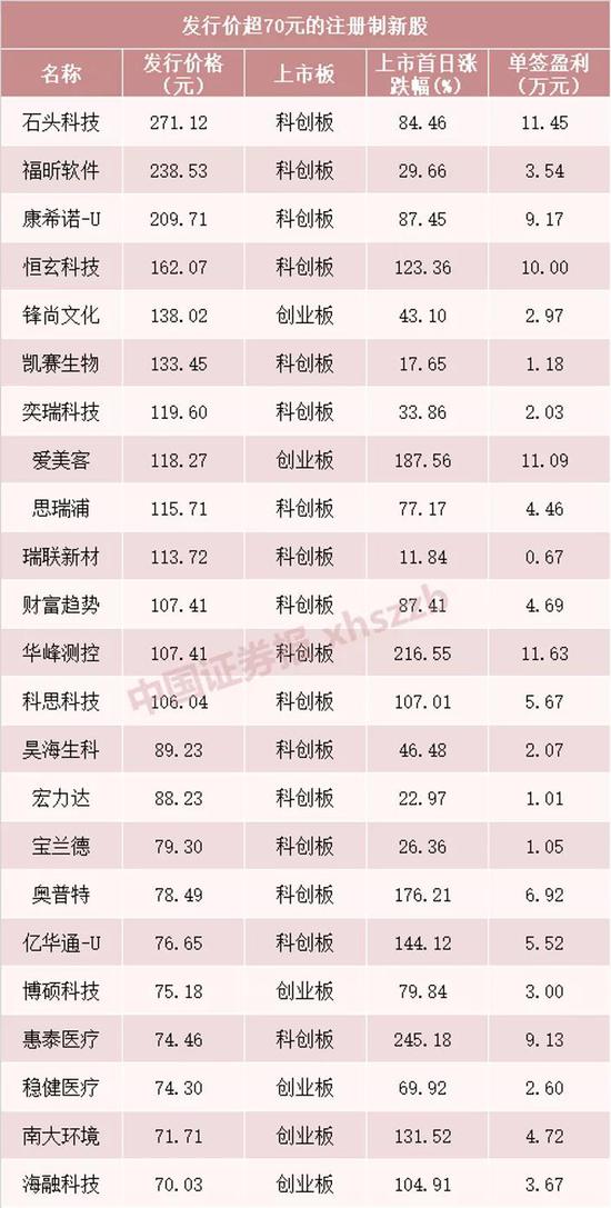 Wind数据显示,在已经上市的注册制股票中(包括科创板和创业板股票),发行价超过70元的共有23只。上市首日收盘平均涨幅为93.68%,平均单签盈利5.14万元。今年上市的17只科创板新股,上市首日收盘平均涨幅为130.04%,平均单签盈利2.24万元。