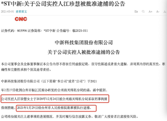 2月28日晚间,*ST中新(603996.SH)公布,公司于2021年2月27日收到台州市椒江区府办转发的台州海关缉私分局的函。函中提到,公司实控人江珍慧于2020年12月24日被台州海关缉私分局采取刑事拘留强制措施,2021年1月29日经台州市人民检察院批准被执行逮捕。