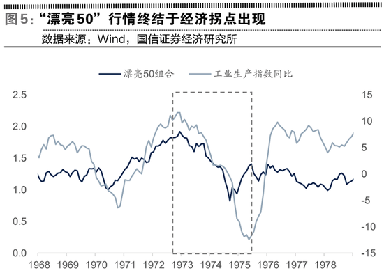 也就是说,经济周期由繁荣转向衰退是导致“漂亮50”瓦解的直接原因。在经济衰退引发的熊市中,“漂亮50”并不具有抵御性,其高估值反而成为了脆弱的根源,更容易受到衰退的负面冲击。