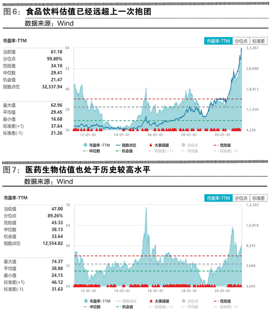 本轮消费抱团产生的估值溢价疯狂程度远超2012年时的消费抱团,目前食品饮料的PE(TTM)约为61倍,是2007年以来的最高水平,远超2012年时40倍的静态估值。医药生物的PE(TTM)约为47倍,也处于过去十年分位数89%的高水平。