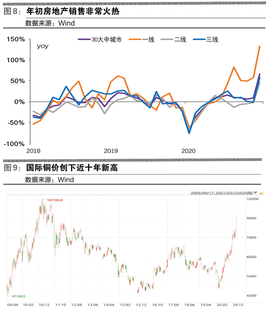 年初房地产的销售也非常火热,严厉的房地产调控似乎也无法阻挡巨大刚需下大家的购房热情。30个大中城市商品房成交面积同比增长67.1%,一线城市的增长达133.5%。即使排除2020年基数低的影响,1月相比2019年同期,30个大中城市商品房成交面积仍增长35%,一线城市的增长达103%。