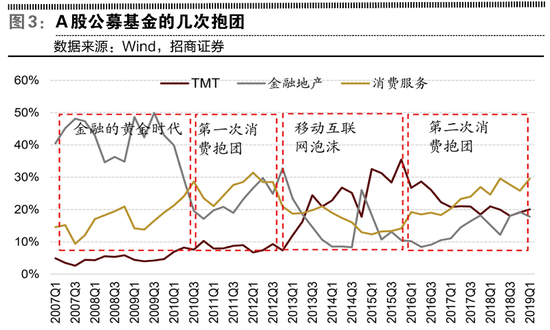 抱团的过程也并非一帆风顺的,2018年中国经济遭遇中美经贸冲突,经济周期下行,A股面临系统性熊市。这让消费的抱团有所中断,公募资金对消费板块的配置占比到2018年四季度一度下降至25.8%。