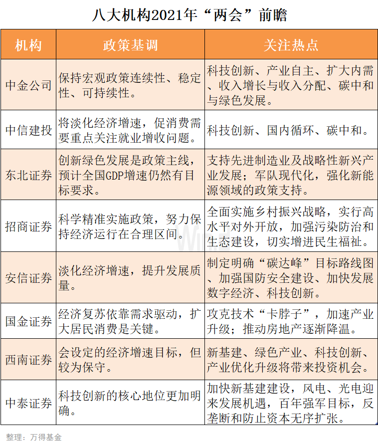 全国两会释放出的经济、改革信号倍受投资者关注,对于2021年的两会,多家知名机构也给出了各自的前瞻: