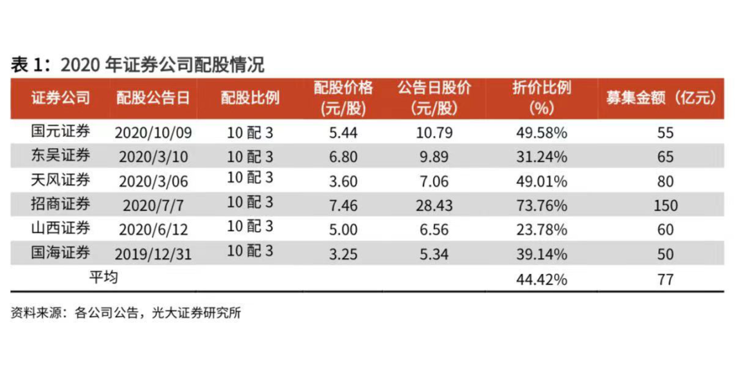 光大证券在研报中指出,截至2021年2月26日,中信证券A股股价27.25元/股, H股股价16.72港元/股,配股平均发行价格分别较A股/H 股折价52.99%/13.64%,两者折价率相差较大。预计实际配股发行价格折价率将平衡A股/H股市场相对保持一致。“参考2020年各券商配股情况,中信证券配股比例15%相对较低;6家券商平均配股价较市价折价约为44%,预计公司配股折价率将维持在这6家券商配股折价率的平均水平左右。”
