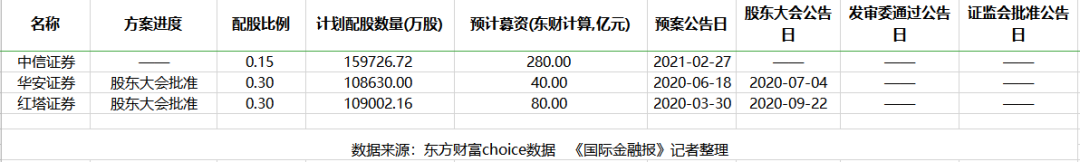 除了中信证券,华安证券、红塔证券正在配股的路上,分别预计募资40亿元、80亿元。