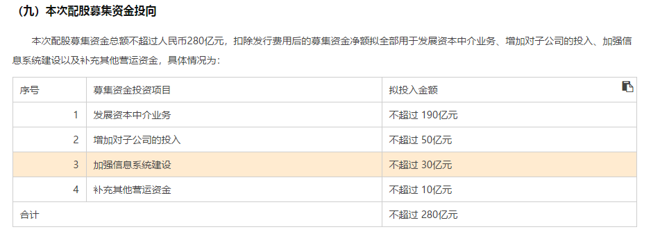 配股细节方面,根据中信证券公告,本次配股募集资金总额不超过人民币280亿元,拟用不超过190亿元资金发展资本中介业务,不超过50亿元增加对子公司的投入,不超过30亿元加强信息系统建设,不超过10亿元用来补充其他营运资金。