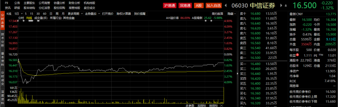 港股方面也飘绿,低开跳水4%,之后跌幅收窄至1.32%报16.5港元/股。AH股溢价率为86%。