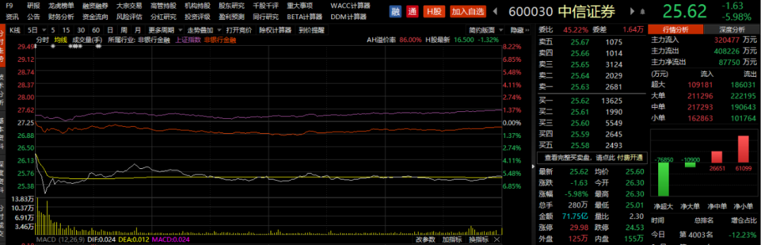 受上周五配股消息影响,加上券商板块低迷,中信证券今早低开重挫,盘中一度跌近8%,最后跌幅收窄至5.98%报25.62元/股,总市值为3311.84亿元,较上个交易日蒸发210.71亿元。今日可谓是放量大跌,换手率为2.86%,成交额近72亿元,主力净流出8.77亿元。