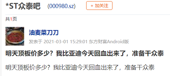 眼看它一路走高,观望的投资者终于忍不住了。股吧里,有投资者表示:“明天准备进10万,能继续涨吗?”还有投资者表示,刚从比亚迪“回血”出来,准备买众泰。
