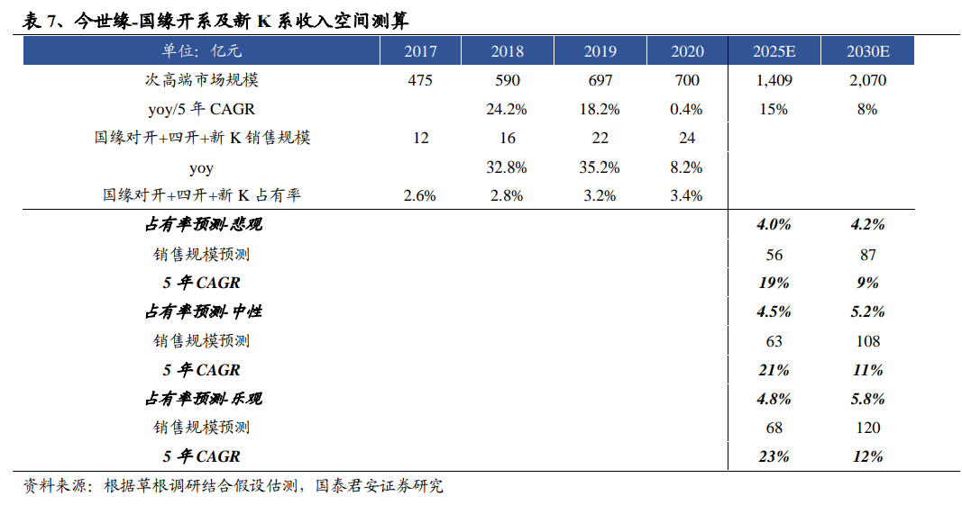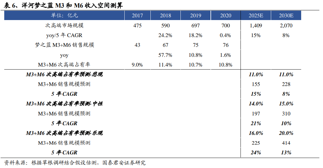 1)依据高端价位市场规模历史增速及GDP增速,结合未来经济预期表现,假设2020-2025年高端市场规模CAGR为17%,2025-2030年市场规模CAGR为10%,基于同样原理,假设2020-25年次高端市场规模CAGR为15%,2025-30年市场规模CAGR为8%。