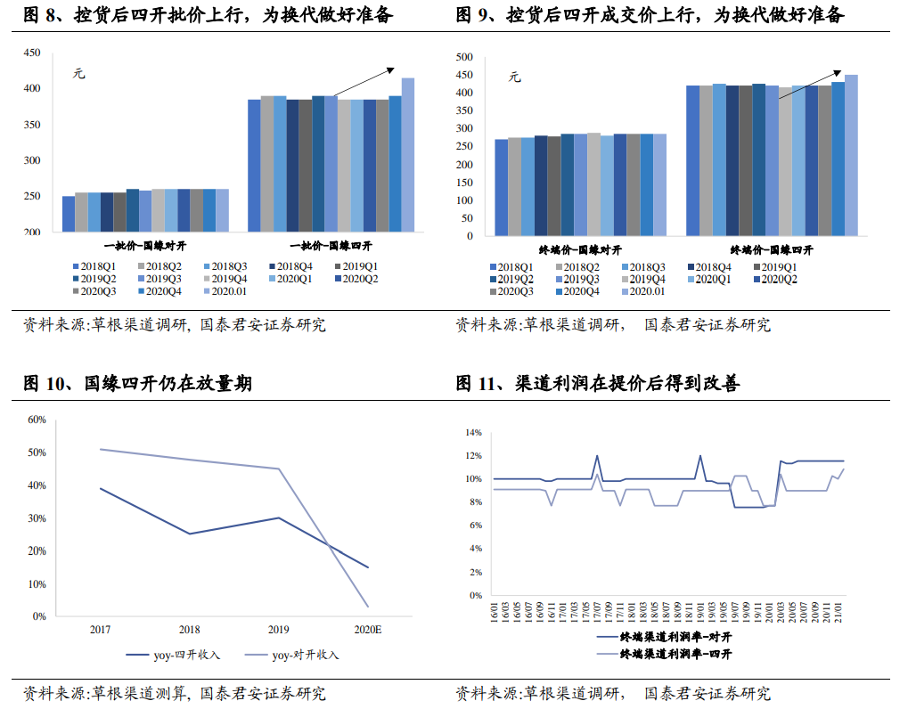 今世缘也采取跟进战略,新四开将迈入更高价位:公司在2021年初针对国缘四开进行控量,并进行两次上调出厂价,就目前情况来看,国缘处于低库存且批价上行,已作好衔接工作,我们估测新版国缘四开将于2021年1季度推出,届时新四开有望迈入500元价位带。