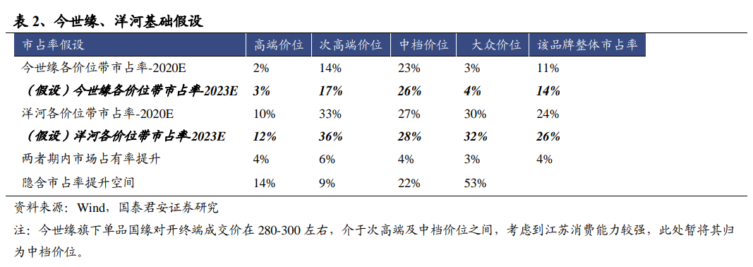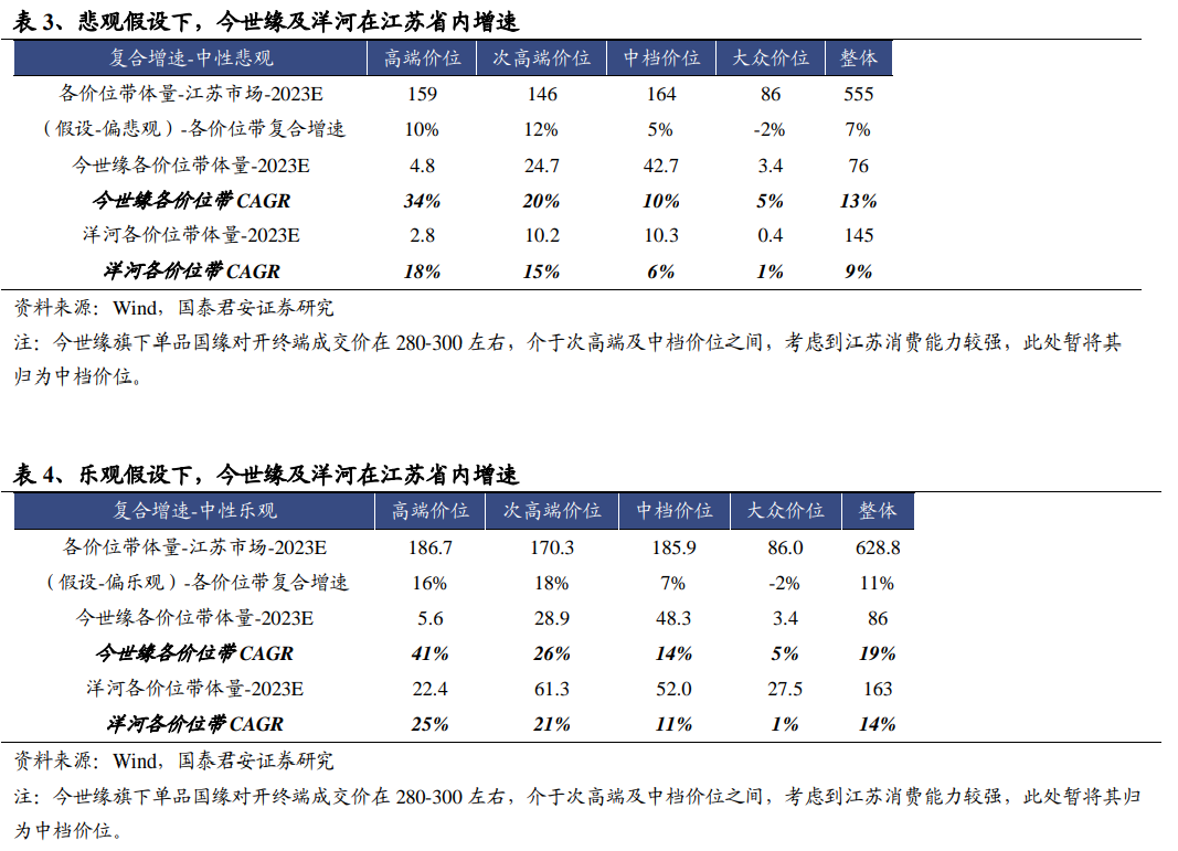 2)根据调研测算,我们认为今世缘及洋河在各价位市占率仍有提升空间。假设今世缘在江苏整体市占率由11%提升至14%,洋河市占率由24%提升至26%。