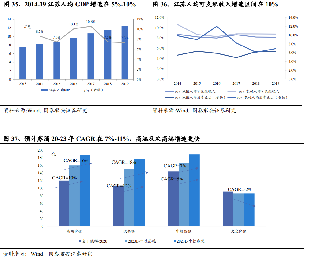 1)白酒市场扩容速率与GDP增速、人均可支配收入增速呈正相关。我们结合本地数据,预计2020-23年江苏白酒消费规模(不含税费)CAGR在7%-11%左右,其中次高端CAGR在12%-18%左右,高端价位CAGR在10%-16%;