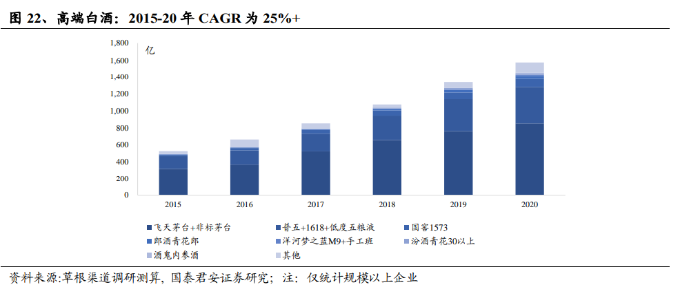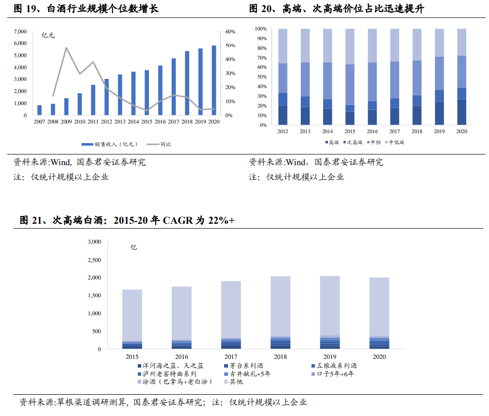 本轮白酒周期消费规模趋稳,行业结构性繁荣趋势明显。就2015-2020年数据来看,上市公司中高端、次高端酒企增速显著领先于其他酒企,表明本轮周期的特点为结构性繁荣,产业增长点主要来自于300元以上价位白酒需求的快速扩张。