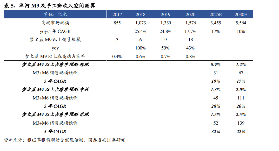 1)我们估测洋河梦之蓝M9及手工班2020-25年收入CAGR在19%-32%,2025-2030年收入CAGR可维持在17%-22%;