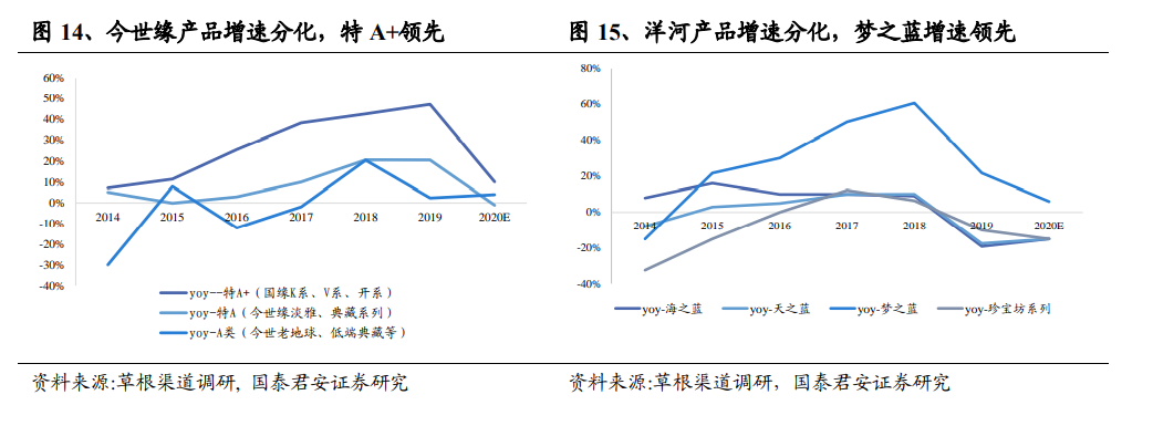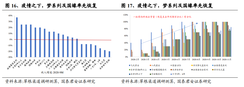2015年以来,洋河、今世缘内部增速分化,折射出苏酒结构性繁荣:2015年以来,梦之蓝系列仍保持高双位数增长,但海之蓝、天之蓝增速逐步收敛至低双位数(调整之前),今世缘特A+类单品(以国缘对开、四开为主)在2015年之后迎来爆发,但特A及以下单品(以今世缘为主)增速承压。2020年疫情也未能改变苏酒结构性繁荣,洋河梦之蓝M6+及今世缘四开在2020年下半年基本恢复自然动销,其恢复进入显著好于海之蓝、天之蓝及今世缘典藏系列。