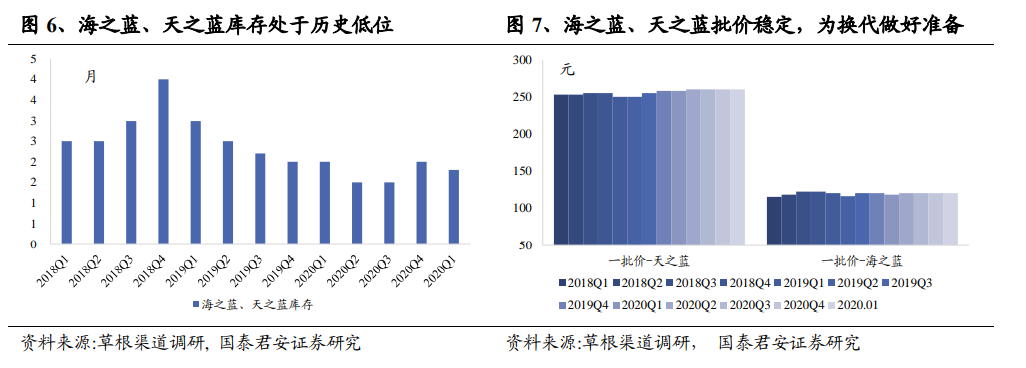 洋河海之蓝、天之蓝市场秩序稳定,预计2021年也有换代可能。经过一年半左右的控货及自然动销,海之蓝、天之蓝库存在2个月内,处于历史低位、批价在过去一年内稳定在120、260左右,已经实现了非常稳定的市场秩序,我们认为,继梦之蓝升级之后,海之蓝、天之蓝有望顺势迈入产品升级序列。