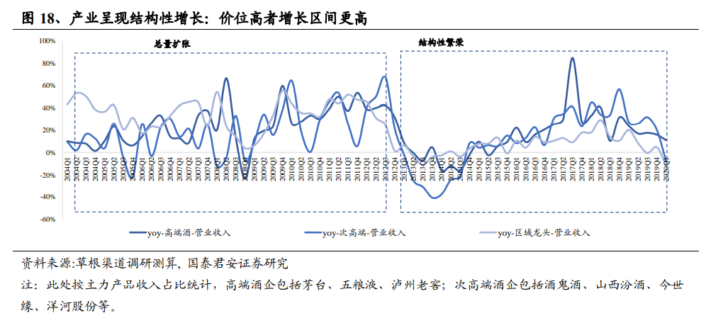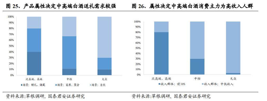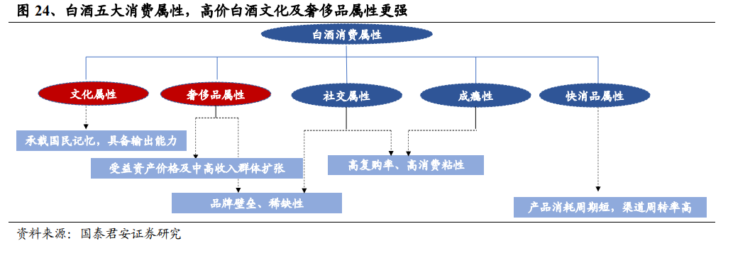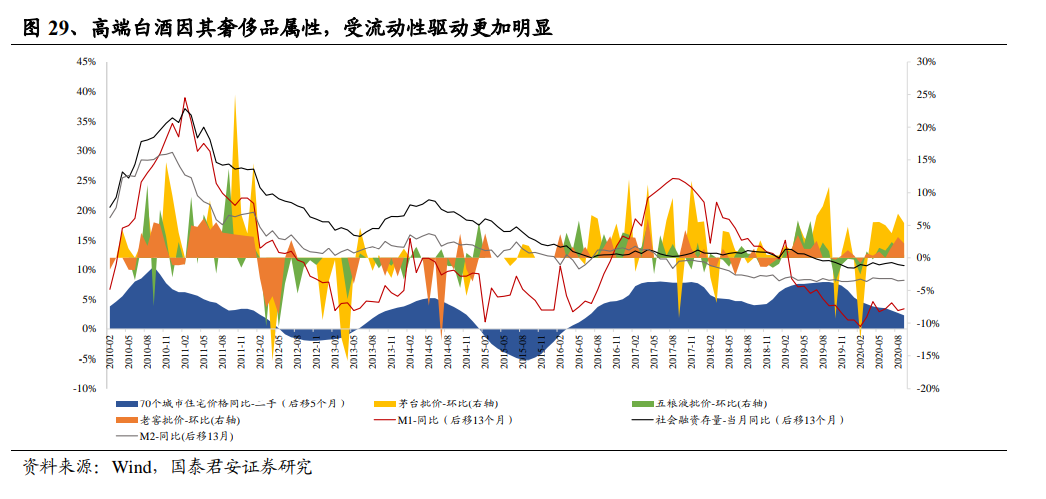 结构性繁荣趋势将持续,流动性及消费升级为中高端白酒需求扩张提供支撑。我们认为,白酒具备五大消费属性(文化属性、奢侈品属性,社交属性,成瘾性及快消属性),而中高端白酒的文化属性及奢侈品属性更为突出,具体体现为目标消费人群收入高、送礼需求多、单品涨价容易等方面。受益于此,相较于普通白酒,中高端白酒消费短期明显受流动性驱动,且长期处在消费升级风口中。